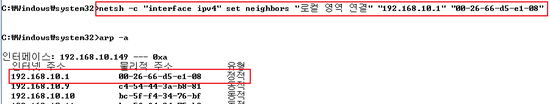 > netsh -c "interface ipv4" set neighbors "(인터페이스)" "(고정시킬 IP 주소)" "(고정시킬 MAC 주소)"