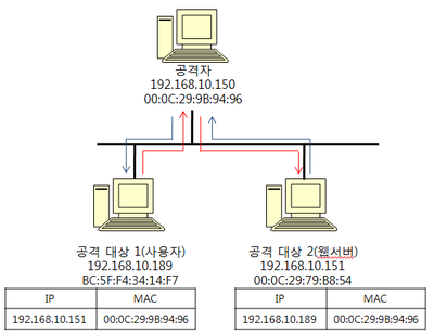 00:0c:29:9b:94:96(공격자)에서 00:0c:29:79:b8:54(공격 대상 웹서버)에게 192.168.10.189(사용자)의 MAC 주소가 00:0c:29:9B:94:96(공격자)이라고 속이고 있습니다.