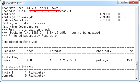 위 명령어를 복사하여 실행하면 레파지토리에 rpmforge가 추가되고 yum을 이용하여 fake 프로그램을 다운로드할 수 있습니다.